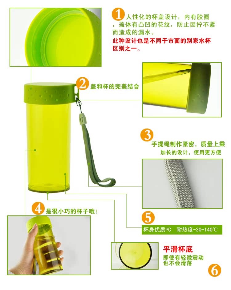 PP環(huán)保材質(zhì);杯身輕巧,結(jié)構(gòu)簡單大方,單手可握緊,杯口寬敞,內(nèi)壁光滑,容易清洗